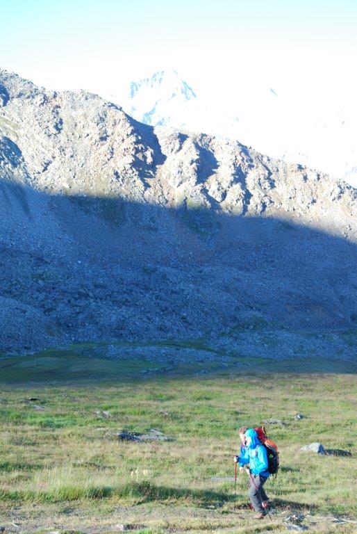 A las cinco arriba, desayuno de pie rápido y a caminar. Cinco horas de ascensión por parajes preciosos salpicados de vacas ¿Cómo coño suben las vacas aquí, volando? con pequeñas llanuras verdes entre loma y loma hasta que ya no hay verde y todo son piedras y la mochila dándome por saco ¡joder! ¡puta mochila! ¡es que la tiro, la tiro a la mierda! y el refugio se nos echa encima, está colgado literalmente del collado que hace de entrada al glaciar desde donde comienza el ataque a la cima.
