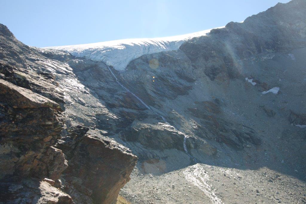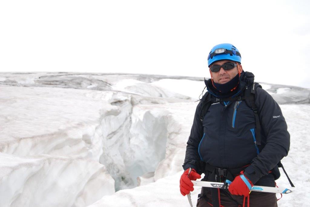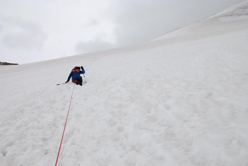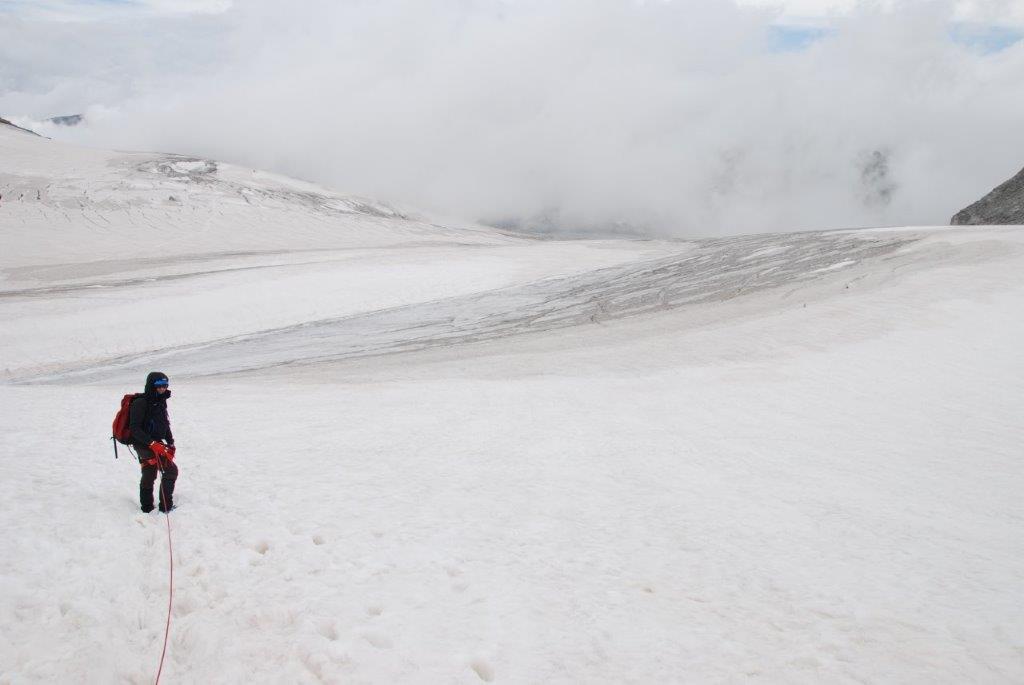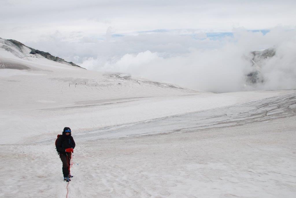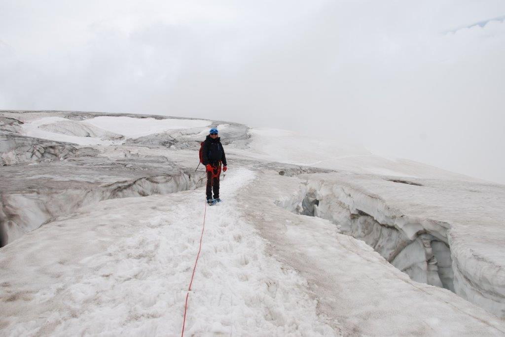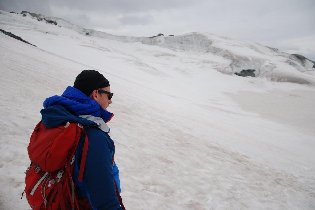 Hicimos caso a la guarda del refugio y dedicamos la tarde a realizar prácticas de avance en glaciar, ver el orden en el que iríamos en la cuerda y escuchar los atronadores sonidos de los glaciares cercanos cuando se mueven. Es como si el mundo se viniese abajo. Tan sobrecogedor como vello. La naturaleza avisándonos de que nosotros solo eramos unos invitados y poniéndonos los mojones, que quede claro quién manda allí.