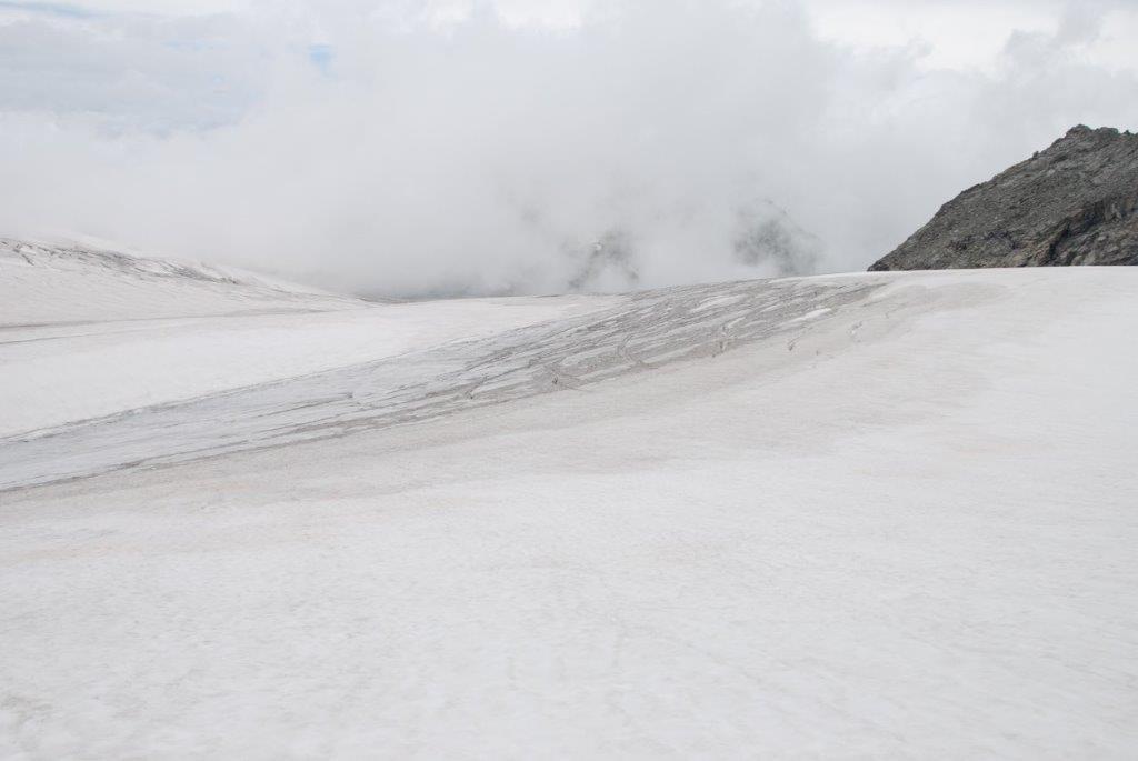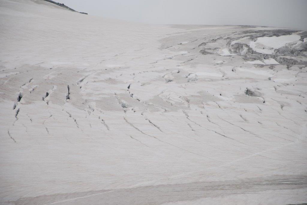 A partir de las 10:30 es cuando todo el mundo debe estar de vuelta en el refugio. Por eso se madruga tanto y se sale con los frontales hacia la cumbre, como una procesión de la Santa Compaña. Hay que aprovechar que la nieve está dura, los crampones agarran mejor y los puentes de nieve sobre las grietas aguantan más. Eso sí que acojona, las grietas del glaciar.