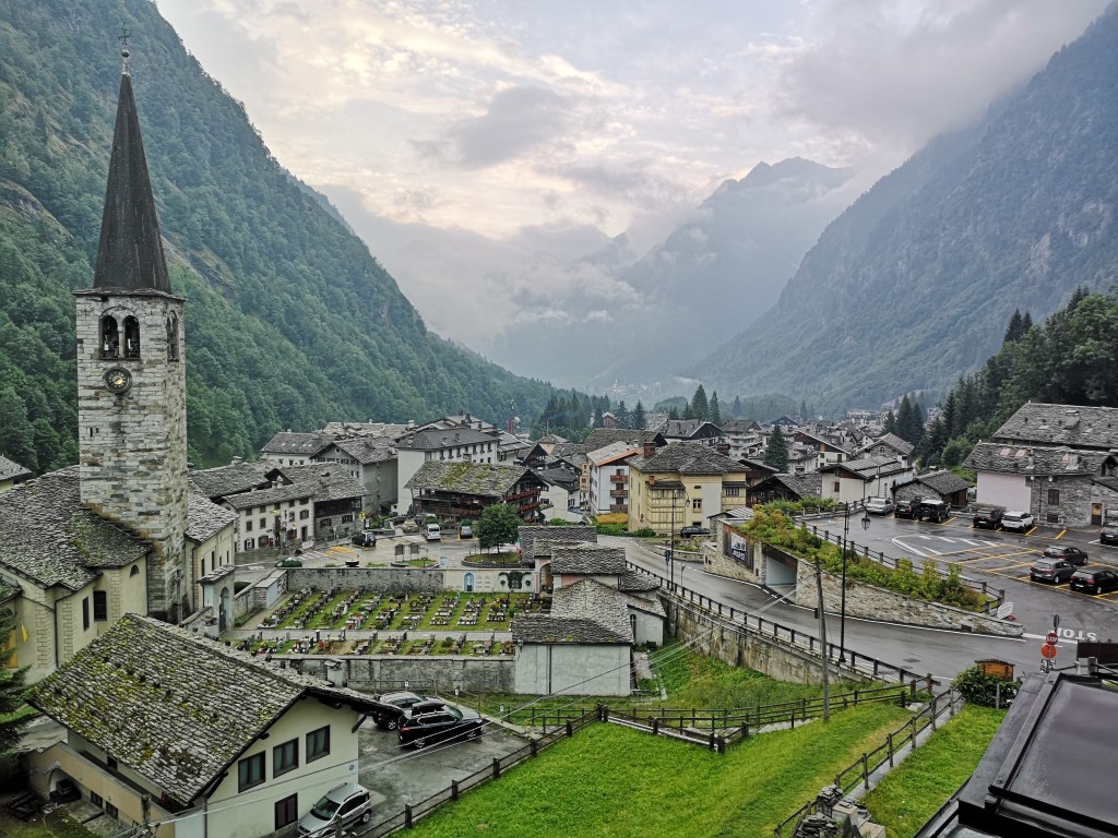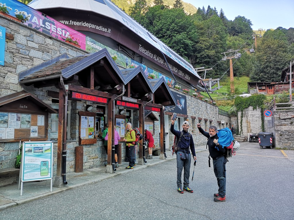 Llegamos a Alagna Valsesia, el pueblo donde dormiríamos antes de subir al teleférico e iniciar nuestra aventura. Es un pueblo pequeño, no sé si llegará a los mil habitantes. Un encanto, muy bonito. Con las casas de madera y la estatua de un señor, supongo que alguien del gremio alpinista, apuntando con su mirada a las altas montañas. Da paso a las cumbres del macizo Monte Rosa en la parte italiana y está lleno de bares y restaurantes. El ajetreo de gente es constante. Imagino que la mayoría con el objetivo de escalar o de pasar unos días en la estación de esquí que hay al final del funicular.
