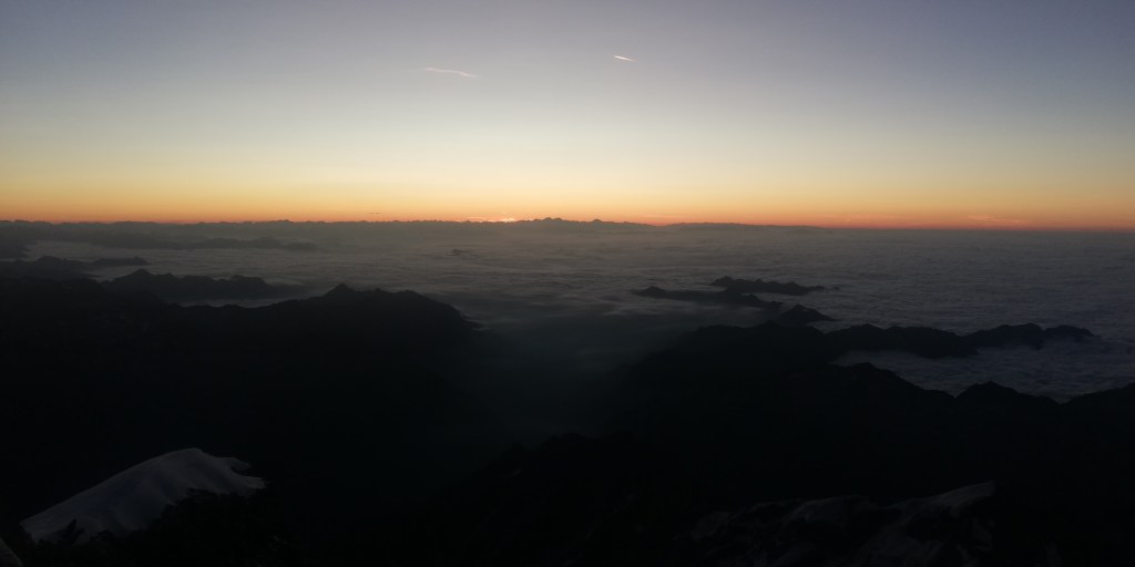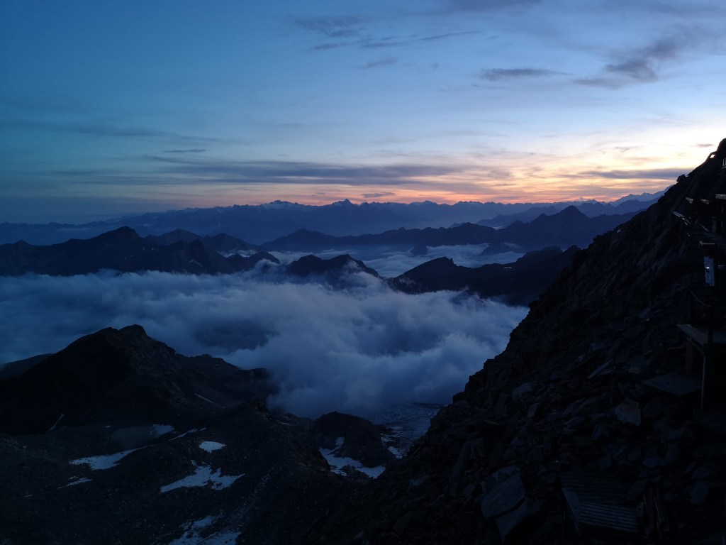 La noche fue un poco larga. A esa altitud ya notas los efectos que esta provoca en el cuerpo y estuve aguantando un persistente dolor de cabeza, aunque no intenso. Creo que el ibuprofeno hizo algo de efecto y al menos pude descansar. Por la mañana me sentí mucho mejor y cargado de energía. Lo primero que hice fue poner en práctica la táctica que aprendí en el Gnifetti para ahuyentar mis demonios. Salir del refugio y empaparme de la grandeza de los montes y el mar de nubes bañado por la luz rojiza del amanecer.