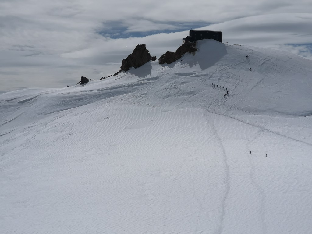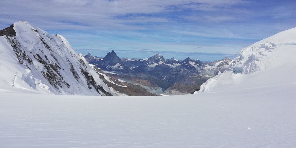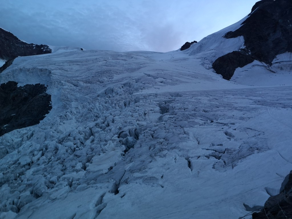 Sabía que faltaba mucho aún pero me sentía tan bien que tenía unas ganas terribles de seguir adelante. Era bonito caminar por la nieve dura. Hasta relajante. Alex se giró con una sonrisa en la cara. Seguimos. Bajamos a la sombra de una pared de hielo y nieve a nuestra derecha. El Cervino vigilaba distante a nuestra izquierda desde el final de un glaciar muy definido con sus franjas negras, grises y blancas que discurría más abajo, en el estrecho valle que formaban las escarpaduras. La pendiente comienza a subir haciendo un gran zigzag hasta situarnos justo entre el monte Zumsteinspitze a la izquierda y la capanna Margarita a nuestra derecha, donde asoma una mancha negra, majestuosa. El refugio a más altitud de Europa. Nuestro destino.