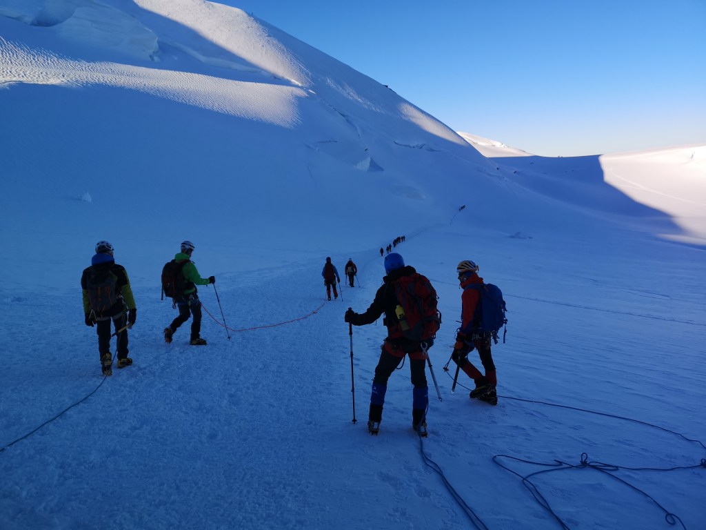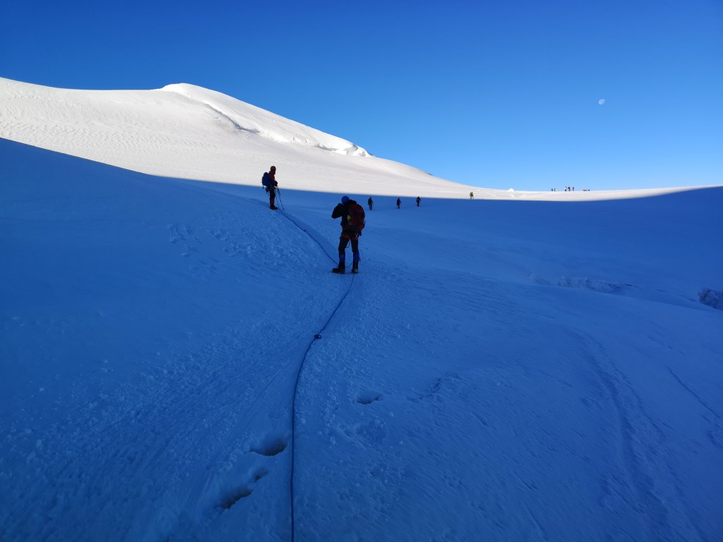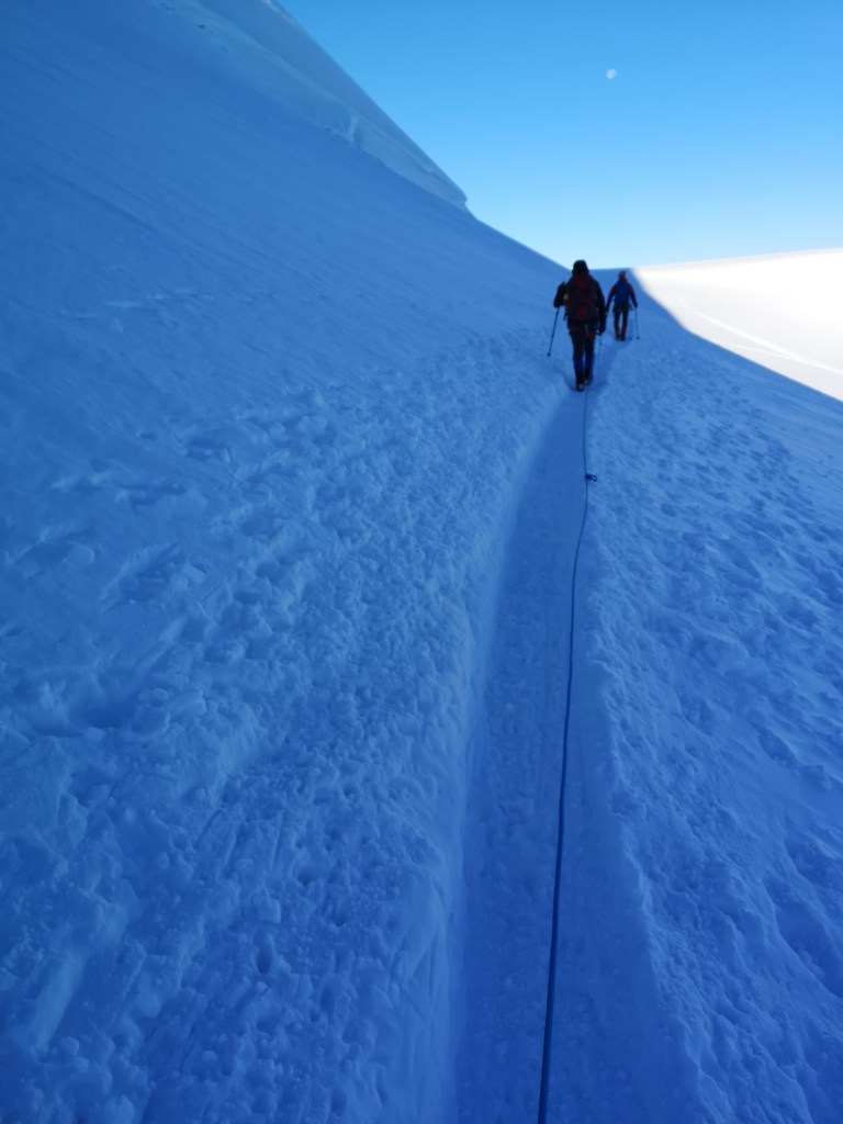 Mi cuerda la componemos Alex, Hector y yo. La otra, Jose, Manolo y Juanvi. Comenzamos a subir siguiendo el carril ya abierto por los que han salido cuando todavía era noche cerrada. Los hay que suben directamente desde el teleférico o el refugio Mantova. También los que tienen intención de hacer varias de las cumbres intermedias. Mi idea es alcanzar el refugio Margarita. Ese es mi objetivo. El resto intentaría subir el Zumsteinspitze, justo frente a la capanna Margarita; «Menudos nombrecitos se gastan para algunos montes»; aunque se preveía viento fuerte en la cumbre y no sabían si sería posible. Por mi parte, lo tenía claro. Si quería vencer de una vez mis miedos, tenía que cumplir con mi objetivo, no más. No quería darle ni la más mínima oportunidad de «joderme».