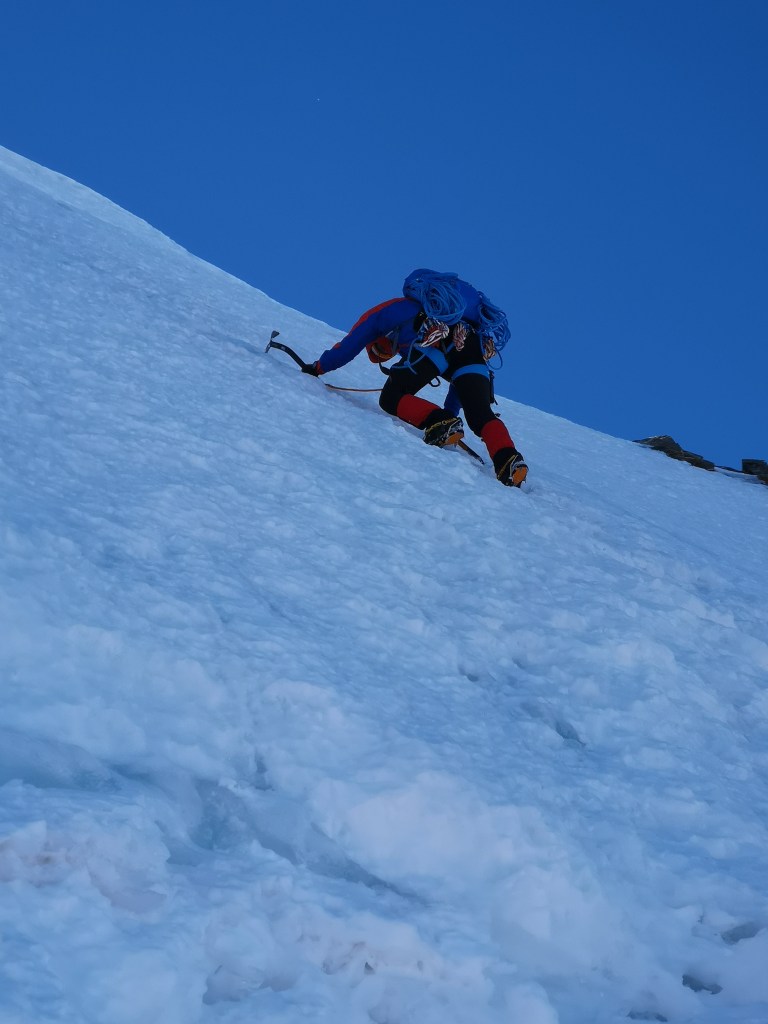 Para llegar al final hay una pequeña ascensión muy empinada donde no es aconsejable cruzarse con nadie porque es un poco comprometido salirse de la senda hecha por el resto de gente. Piolet, paso adelante, polet, paso adelante, así hasta que, por fin llegamos al refugio.